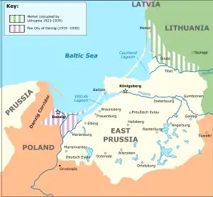 Важливий морський порт у Східній Пруссії — Клайпеда (нім. Memel) статтею 28 Версальського договору відокремлено від Німеччини, а на підставі статті 99 цього договору передано в управління союзникам. Керівництво областю перебрала на себе Франція, між тим, Литва продовжувала добиватися контролю над краєм, заявляючи, що він повинен належати Литві на підставі наявності там значної частки литовського населення (див. Мала Литва) та з огляду на те, що це був би єдиний вихід для Литви до Балтійського моря. Польща також претендувала на цю територію. Оскільки союзні держави вагалися з ухваленням рішення і здавалося, що цей регіон залишиться вільною державою на зразок вільного міста Данциг, Литва взяла на себе ініціативу і влаштувала у січні 1923 Клайпедський заколот[1]. Радянська Росія і Німеччина підтримали цю акцію[2]. Область приєднано до Литви у статусі автономної території зі своїм власним парламентом. Площа краю становила близько 2 400 км², на якій проживало приблизно 140 000 осіб[3].