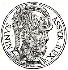 Син Бела, правнук Геракла [2]. Згідно з поглядами греків, першим з азійських царів почав вести війни з сусідами і підкорив їх [3]. У союзі з аравійцями протягом 17 років завоював Західну Азію, перемігши і убивши царів Вірменії Барзана і Мідії Фарна. Потім пішов війною на бактрійского царя Оксіарта, з двохмільйонною армією обложив її столицю Бактру.