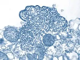 | Електронна мікрофотографія, на якій зображена частинка вірусу Ніпа (фіолетова) під час зараженою культури клітин Vero (коричневий колір) | |