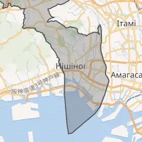 Розміщується в центральній частині острова Хонсю, на північному узбережжі затоки Осака, між містами Осака та Кобе. Загальна площа — 99,96 км². Простягається з півночі на південь на 20 км.