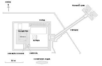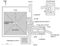 У плані святилище було прямокутником 80 × 110 м, оточеним високою й товстою кам'яною стіною. З південного, західного та північного боків всередині стіни були вузькі коридори, що вели до різних частин святилища. Навпроти входу розташовувався великий двір із жертовником у глибині. Позаду височіла головна частина будівлі, в якій археологи вбачають прототип обеліску.