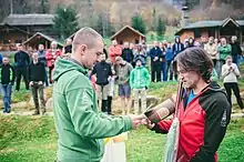 ![]() Сергія Сапігу (праворуч; переможця Чорногірського марафону 2017 у категорії "Чоловіки") вітає Володимир Горон (ліворуч; один із організаторів змагань). Нагородження відбувається у кемпі "Білий Слон", що у с. Дземброня (місце фінішу марафонців). |