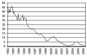 - Росія — 1991 року, з 1995 року після гіперінфляції 1992—1994-х років.
