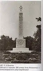 Обеліск було встановлено біля входу до Верхнього (Олександрівського) саду 1914 року на честь 300-річчя царювання російської царської династії Романових. Початково його вінчав двоголовий орел — символ Російської імперії, нижче містився герб Романових — лев з щитом і мечем, ще нижче були перелічені імена всіх правителів Романових і герби губерній та областей Російської імперії, а також герби Великих князівств.