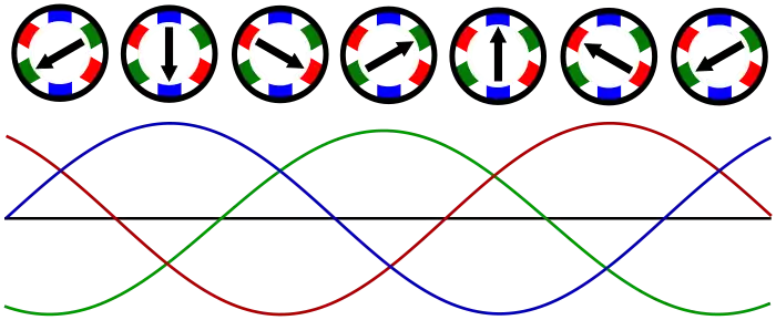 Магнітне поле, що симетрично обертається по осі, може бути отримано за допомогою двох полярних котушок, які приводяться в рух при 90° фазі. Найбільш поширеними у здобуванні такого магнітного поля є набір з трьох котушок, оскільки він сумісний з симетричною 3-фазною синусоїдальною променевою системою. Три котушки керуються кожним набором, що рухається на 120° у фазі від інших.