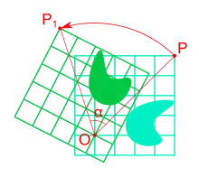 Для проведення обертання з використанням матриць, точку записують у вигляді вектора, потім множать на матрицю від кута , схожу на: