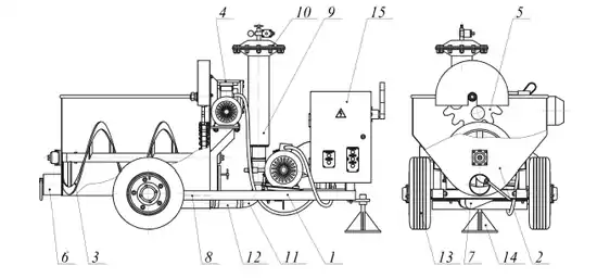 На рисунку показано установку для змішування будівельної розчинної суміші. Для підвищення технологічних можливостей її додатково обладнують насосом для перекачування будівельної розчинної суміші, наприклад, однопоршневим.