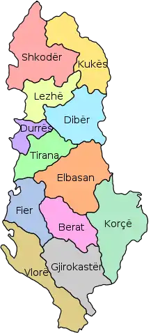 | Ельбасан | Ельбасан | Центральний регіон | 3199 км2 | 270 094 | 41°6′N20°8′E |
