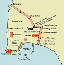 Гійом де Боже, великий магістр тамплієрів, учасник сотень битв, прийняв командування гарнізоном, який складався приблизно з 120 добірних лицарів-тамплієрів і госпітальєрів та загону в 500 піших і 200 кінних воїнів під командуванням короля Кіпру. Ці сили були розбиті на чотири підрозділи, кожен з яких обороняв свою ділянку стіни; першим з них командував Гуго де Грандісон, англійський лицар.