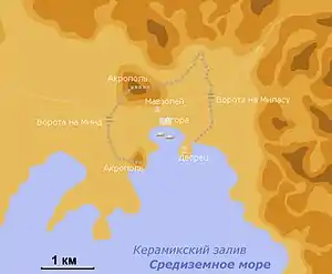 ![]() Схема Галікарнаса в античний час. Лінія стін відновлена за збереженими руїнами. Александр штурмував місто з боку східної стіни. Схема Галікарнаса в античний час. Лінія стін відновлена за збереженими руїнами. Александр штурмував місто з боку східної стіни. | |||||||