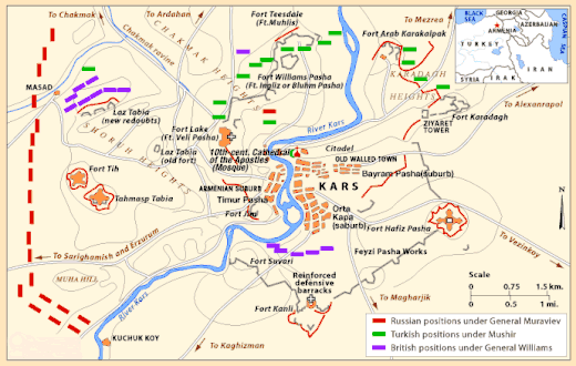 Перша атака була відбита османським гарнізоном під командуванням британського генерала сера Вільяма Вільямса. Росіяни почали будувати укріплення і почали облогу, яка тривала до листопада.