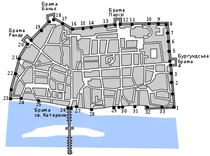 | 17 | Вежа Ом (на площі Мартруа) | 18 | Дві вежі над брамою Бані (північно-західний кут стіни. Додатково захищалися зовнішнім бульваром) | ||