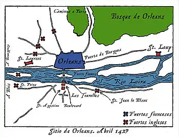 Орлеан на початку XV століття був потужною фортецею, зведеною у вигляді неправильного чотирикутника за тією ж схемою, що й більшість фортець римського часу. Площа поселення становила, за різними підрахунками, від 25 до 37 га[9]. Місто оточувала стіна завдовжки 2590 м[9], крізь яку до міста вело п'ять брам: