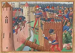 Найбільшу потужність мала міська артилерія, причому під час усієї облоги поповнення артилерійського парку проводилося безупинно. Підраховано, що на початку облоги в місті було 75 гармат усіх калібрів, до кінця облоги їх кількість зросла до 105[12]. Міська артилерія поділялася на великокаліберні бомбарди, дрібніші мортири, гармати (veuglaires) й ручні кулеврини.