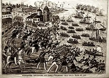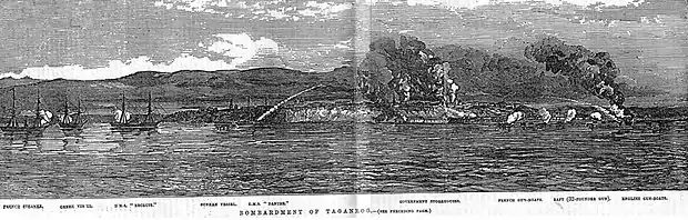 22 травня британо-французький ескадрон, який складався з 17 збройних парових човнів та 20 канонерських човнів, з'явився під Таганрогом. Командувачі експедиції передали місту ультиматум, з вимогою здати місто. Човен з французькими послами була зустрінута чиновником Толстого. Через годину посланці повернулися з відмовою. Британсько-французький флот почав бомбардування Таганрога, яка тривала шість з половиною годин. За нею послідувала висадка десанту в центрі Таганрога. Однак, союзники були відкинуті назад козаками і добровольчим корпусом. Бачачи, що місто неможливо взяти з ходу, флот відступив.