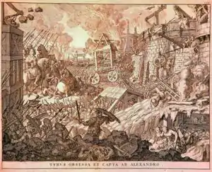 | Оскільки тепер від флоту тірійцям не було ніякої користі, то македонці змогли підвести машини до самих стін. Машини, що стояли на насипу, не завдали стіні ніяких значних пошкоджень: така вона була міцна. Підвели деякі судна з машинами і з того боку міста, яка була звернена до Сидону. Коли і тут нічого не добилися, Александр, продовжуючи всюди свої спроби, перейшов до південної стіни, зверненої убік Єгипту. Тут, нарешті, стіну на значному проміжку розхитали; частина її обламалися і звалилася. Там, де вона зруйнувалась, зробили, як було можливо, містки і протягом короткого часу намагалися йти на приступ; тірійці, проте, легко відкинули македонців.[7] |