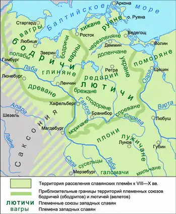Лютичі (Liutizi) займали території, що відомі сьогодні як Мекленбург (Mecklenburg), і розширили володіння до річки Одри (Oder) на сході. Ободрити розселились на землях, розташованих на північний захід від лютичів. Сораби (Sorabi), розташувалися на південь від Берліна.