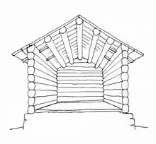 У традиційній російській рубленій хаті дахи часто влаштовували рубленими («самцевими»)[2]: крокви в них були відсутні, а лати (рос. слеги) врубали в дедалі коротші догори колоди щипців. На лати вже настилали покрівельне покриття (тес, дранку, ґонт-леміш). Давнішою даховою конструкцією був дах «на курицях»: до гребеневої лати (рос. коньковая слега) і нижніх лат (слеги, решетины) кріпили поперечні стовбури дерев з кокорами унизу — куриці; на кокори укладали поздовжні бруси — потоки[3]. Дошки-тесини нижніми кінцями входили у пази потоків, верхніми — у пази гребеневої лати. Верхні крайки дахових дощок всіх типів покрівлі закривали на гребені видовбаною колодою — охлупнем (рос. охлупень)[4] чи шеломом, іноді з кінцем у вигляді кінської голови. Традиційним способом кріплення був безцвяховий: охлупень притискували до гребеневої лати спеціальними шпонками — сороками чи стамиками[5]. Торці лат, що виступали на щипцях, могли прикривати дошками — так званими причолинами (рос. причелины)[6], зазвичай вирізьбленими. Місце, де вони сходилися, закривали короткою вертикальною дошкою — полотенцем, також прикрашеною різьбленням.