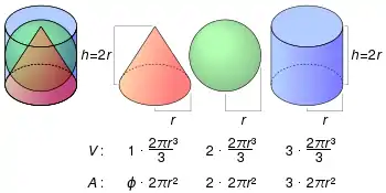 Вищенаведені формули можна використати для того, щоб показати що об'єми конуса, кулі і циліндра з однаковими радіусами і висотами мають пропорцію 1 : 2 : 3, відповідно.