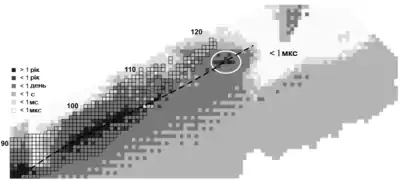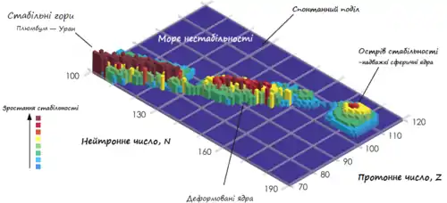 Оганесон (118 рядок) є дещо понад островом стабільності (обмежений білим колом), а тому його ядра є дещо стабільнішими, ніж передбачалося.