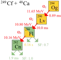 та чи збігається радіоактивний розпад 290Lv із радіоактивним рядом ядер 294Og. Дочірнє ядро 290Lv є надзвичайно нестабільним із часом життя 14 мс, розпадаючись до 286Fl, що відтак може спонтанно поділитись або ж розпастись альфа-шляхом до 282Cn, що потому спонтанно поділиться.
