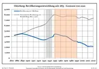 Динаміка населення з 1875 року в сучасних кордонах (Синя лінія: населення; Пунктир: відносна порівняльна динаміка населення землі Бранденбург; Сірий фон: період Третього рейху; Помаранчевий фон: період НДР)