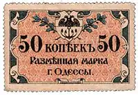 Крім рублевих банкнот, в перші місяці 1918 року стали друкуватися і входити в оборот міські розмінні марки. У березні були випущені марки-гроші номіналом 50 копійок, у квітні — 15 і 20 копійок. На їх лицьовій стороні був зображений герб Одеси в орнаментальному обрамленні, на зворотному — номінал в розетці, рамка і напис: «Размѣнная марка г. Одессы поддѣлка преслѣдуется закономъ». Малюнок марок був виконаний художником Амвросієм Ждахою[1].