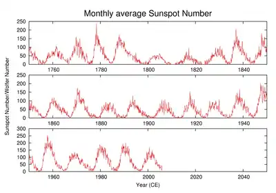 Хоча для визначення рівня сонячної активності можна використовувати різні індекси, найчастіше для цього застосовують усереднене за рік число Вольфа. Певні за допомогою цього індексу 11-річні цикли умовно нумеруються починаючи з 1755 року. У 2008 році[1][2] (за іншими даними — в 2009 році[3]) почався 24-й цикл сонячної активності.