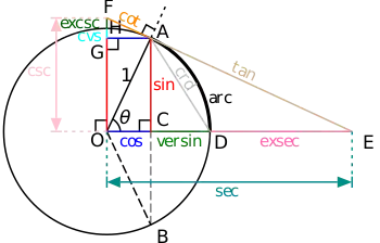 Синус та косинус можуть бути описані наступним чином: об'єднавши будь-яку точку на одиничному колі з початком координат , ми отримаємо відрізок, що знаходиться під кутом відносно додатного напрямку осі абсцис. Тоді: