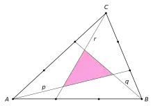 У евклідовій геометрії трикутнику ABC містить трикутник, площа якого становить одну сьому площі ABC, який можна побудувати так: сторони цього трикутника лежать на променях p, q, r, де