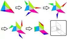 Гуго Штейнгауз запропонував відбити (центральний) трикутник зі сторонами p, q, r відносно його сторін і вершин.[1] Ці шість додаткових трикутників частково покривають ABC і залишають шість «звисаючих» зайвих трикутників, що лежать поза ABC. Зважаючи на паралельність під час побудови (як показав Мартін Гарднер у он-лайн журналі Джеймса Ренді), очевидні парні збіги «звисаючих» та відсутніх частин АВС. Як видно з графічного розв'язку, шість відбитих трикутників разом з оригіналом дорівнюють цілому трикутнику ABC.[2]