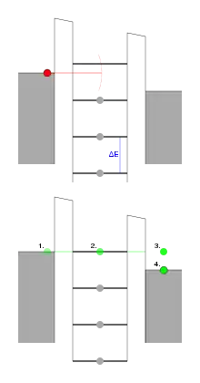 Енергетичні рівні острівця знижуються коли до електроду затвора прикладається додатна напруга. Електрон (зелена 1) може тунелювати на острівець (2), на попередньо вакантний енергетичний рівень. Звідси він може тунелювати на електрод стоку (3.), де непружно розсіюється і досягає рівня Фермі на ньому.