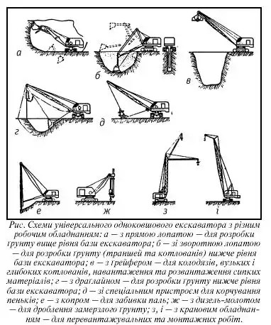 Екскаватор одноківшевий складається з робочого, механічного, ходового і силового обладнання, механізмів управління, платформи з рамою, надбудови і кузовів. Виконуються на гусеничному, крокуючому (тільки драґлайни з ковшом місткістю понад 4 м3) або пневмоколісному (головним чином машини з ковшами місткістю до 0,8 м3) ходу з електричним, електрогідравлічним або іншим приводом. Робочий цикл складається з чотирьох послідовних операцій: