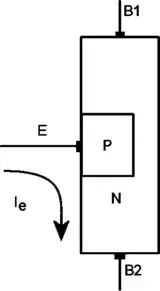 Основою транзистора є кристал напівпровідника (наприклад n-типу), який називається базою. На кінцях кристала є омічні контакти Б1 і Б2, між якими розташовується область, що має випрямляючий контакт Е з напівпровідником p-типу, що виконує роль емітера.