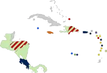 - В Мексиці: федеральний округ Мехіко і двадцять п'ять штатів (Агваскальєнтес, Гуанахуато Ідальго, Кампече, Керетаро, Кінтана-Роо, Коауїла, Коліма, Мічоакан, Морелос, Наярит, Нижня Каліфорнія, Нуево-Леон, Оахака, Південна Нижня Каліфорнія, Пуебла, Сакатекас, Сан-Луїс-Потосі, Сіналоа, Сонора, Тласкала, Халіско, Чивава, Чіапас і Юкатан).