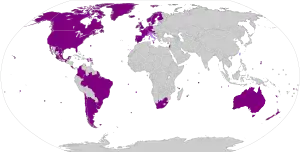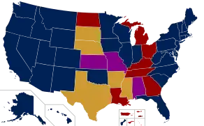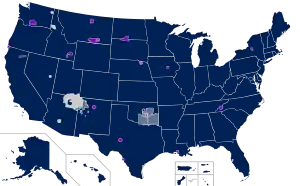 - У США: федеральний округ Колумбія, усі п'ятдесят штатів, чотири території (Віргінські острови, Гуам, Північні Маріанські острови й Пуерто-Рико), а також сорок п'ять юрисдикцій корінних американців.