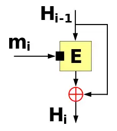 В даній схемі блок повідомлення і попереднє значення геш-функції надходять в якості ключа й блоку відкритого тексту відповідно на вхід блочного шифру . Одержаний в результаті шифрування блок закритого тексту підсумовується (операція XOR) з результатом попередньої ітерації гешування () для отримання наступного значення геш-функції (). [5]