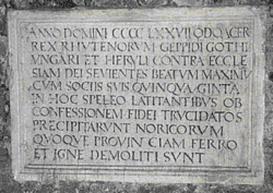 | Року Божого 477 Одоакер, король рутенів, а також гепідів, готів, унгарів і герулів, виступаючи проти церкви Божої, благочестивого Максима з його 50 учнями, що молилися з ним в цій печері, за сповідання віри жорстоко мучено та скинуто вниз, а провінцію Норикум мечем і вогнем спустошивши[8] ». |