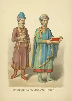 Одяг на малюнку з «Ізборника»: князь був одягнений синього кольору з червоною каймою та золотими поручами, корзно було теж синього кольору, обшите золотою каймою і защіпалося на правому плечі на червону застіжку, від якої відходили золоті пелюстки. На ногах сині чоботи, а на голові шапка з піднятими вухами. Княгиня одягнена в верхній одяг червоного кольору з каймою, з широкими рукавами, підтягнутими на ліктях і підпоясаний золотим поясом. Під верхнім одягом був ще нижній, теж червоного кольору, з золотими поручами на рукавах. Син князя одягнений в верхній одяг малинового кольору з червоною каймою, як у князя, з золотим поясом, та відлогами на грудях, обшитими також золотом. На грудях нашиті золоті петлиці. На голові дівчата Княжої Русі носили головну прикрасу — стрічку.