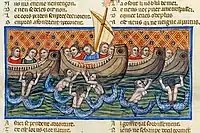| 5 | День 7-й і далі до кінця 31-го дня | Рада богів. Вони посилають Гермеса до німфи Каліпсо з наказом негайно відпустити Одіссея. Каліпсо дає Одіссеєві знаряддя, потрібні для побудови плота. За чотири дні судно готове, і на п'ятий день Одіссей відпливає, одержавши від Каліпсо все потрібне в дорозі. Сімнадцять днів плавання триває благополучно. На вісімнадцятий день Посейдон, повертаючись від ефіопів, упізнає в морі Одіссея, що плив на легкому своєму плоті; він насилає бурю, яка руйнує пліт; але Одіссей одержує від Левкотеї намітку, яка рятує його від затоплення; цілих три дні носять Одіссея бурхливі хвилі; нарешті надвечір третього дня він виходить на берег феакійського острова Схерії[2]. |