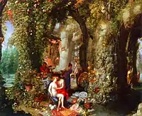 | 10 | Вечір 33-го дня | Одіссей продовжує розповідати про свої пригоди. Прибуття на острів Еолію. Еол, володар вітрів, дає Одіссеєві провідником Зефіра і доручає йому міцно зав'язати міх, в якому містяться інші вітри. Підійшовши на віддаль, з якої видно Ітаку, Одіссей засинає. Його супутні розв'язують міх; здіймається велика буря, яка приносить їх знову до Еолового острова. Але розлючений Еол наказує Одіссеєві забиратися геть. Лестригони знищують одинадцять кораблів Одіссеєвих; з останнім пристає він до острова Кіркеї. Вона перетворює його супутців у свиней; але Гермес дає йому засіб подолати її чари. Перемігши Кіркею, Одіссей умовляє її відновити людський вигляд його супутцям. Провівши рік на острові, він вимагає нарешті, щоб вона повернула його на батьківщину; але Кіркея наказує йому спершу відвідати Океан біля входу в оселю Аїда розпитати пророка Тіресія про свою долю. Смерть Ельпенора[2]. |