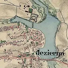 Село Озерна на березі річки Восушки, близько 1787 року. Карта Йосифинської метрики (Josephinische Landesaufnahme).