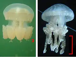 - Вночі та до 14 годин дня медузи здійснюють повторювані вертикальні пересування між поверхневим шаром озера і прикордонною зоною безоксигенового шару озера, ймовірно щоб поглинати поживні речовини безпосередньо з води[12].