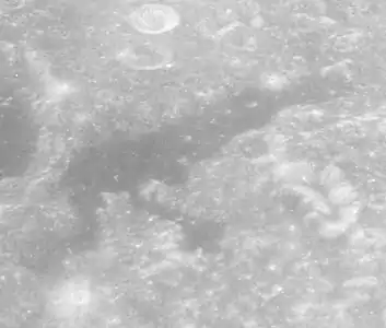 - Знімок із високим розділенням, зроблений зондом LRO. Посередині видно частину Озера Наполегливості з найбільшим його кратером. Дзеркально обернене зображення (північ унизу, схід праворуч); ширина — 5,4 км.
