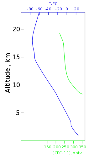 Іноді стверджується, що оскільки молекули фреонів набагато важчі за азот (N2) і кисень (O2), то вони не можуть досягти стратосфери в значних кількостях. Проте атмосферні гази перемішуються повністю, а не розшаровуються або сортуються по вазі. Процеси вертикального переносу повітряних мас, конвекції і турбулентності повністю перемішують атмосферу нижче турбопаузи набагато швидше. Тому навіть такі важкі гази, як інертні або фреони (CFC), рівномірно розподіляються в атмосфері, досягаючи, зокрема, і стратосфери. Експериментальні вимірювання їх концентрацій в атмосфері підтверджують це, дивіться наприклад графік праворуч. Також вимірювання показують, що потрібно близько 5 років для того, щоб гази, що виділилися на поверхні Землі досягли стратосфери. Якби гази в атмосфері не перемішувалися, то такі важкі гази з її складу як аргон (Ar) і вуглекислий газ (CO2) утворювали б на поверхні Землі шар в декілька десятків метрів товщиною, що зробило б її нежилою. На щастя це не так. Криптон (Kr) з атомарною масою 84, і гелій (He) з атомарною масою 4, мають одну і ту ж відносну концентрацію, що біля поверхні, що на висоті 100 км. Звичайно, все вищенаведене вірне лише для газів, які порівняно стабільні, як фреони чи інертні. Речовини, які вступають в реакції, а також піддаються різному фізичному впливу, скажімо, розчиняються у воді, мають залежність концентрації від висоти.