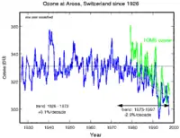Це неправильно, бо рівень озону падає всюди. Це показують результати довготривалих вимірювань концентрації в різних точках планети. Ви можете подивитися на графік зміни концентрації озону над Аросою в Швейцарії праворуч.