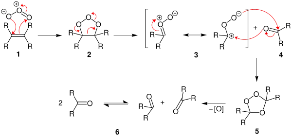 Молекули озону приєднуються за місцем подвійного зв'язку, утворюючи нестійкі, вибухонебезпечні озоніди. При дії води вони швидко гідролізуються із утворенням альдегідів або кетонів. Спрощено реакція озонолізу має наступний запис: