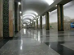 Колони станції покриті червонуватим мармуром і прикрашені керамічним орнаментом. На бічних стінах сходів, що спускаються на платформу, прикрашені панно на тему за творами Айбека у вигляді книжкових сторінок. На одному з них зображено письменник. При оздобленні станції широко використано мармур, граніт, кераміка та інші матеріали.