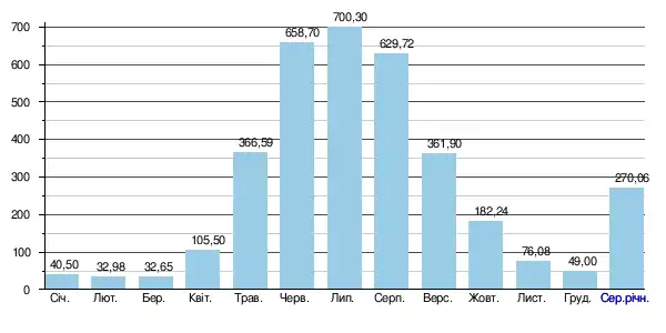 За період спостереження встановлено, що мінімальний середньомісячний стік становив 32,65 м³/с (у березні), що відповідає 4,7 % максимального середньомісячного стоку, який відбувається у липні місяці та становить майже — 700,3 м³/с і вказує на доволі велику амплітуду сезонних коливань.
