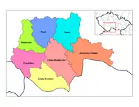 У 1960 році Чехословаччина була перерозподілена на округи (okres, множ. okresy ) часто без врахування традиційного поділу та місцевих відносин. На території Чехії було 75 округів; у 1990-х рр. був доданий 76-й округ Єсеник, який був виділений з округа Шумперк. Три складалися виключно з статутних міст (statutární města, одн. město ) Брно, Острава і Пльзень, які отримали статус округів лише в 1971 році; столиця Прага (Hlavní město Praha) мав особливий статус, але десять районів Праги ( obvody ) були в певному сенсі еквівалентними округам.